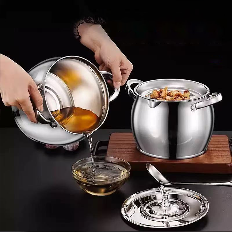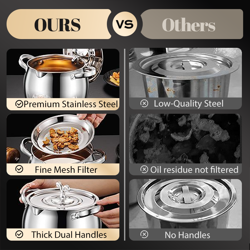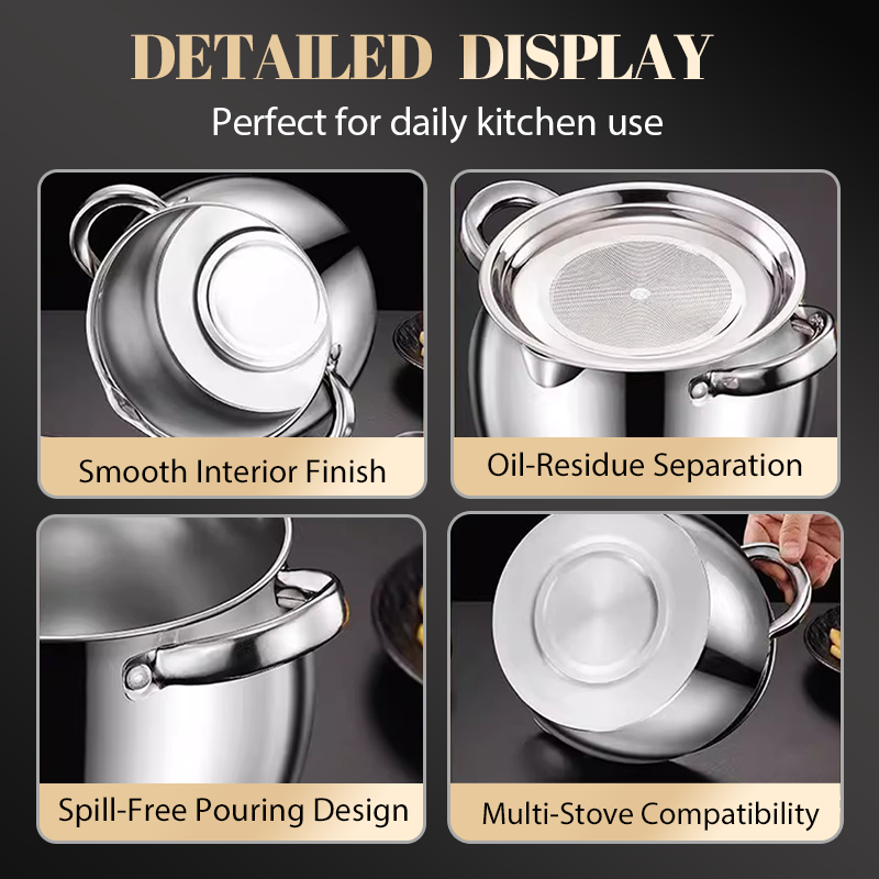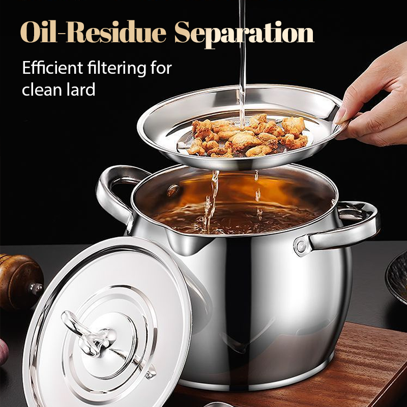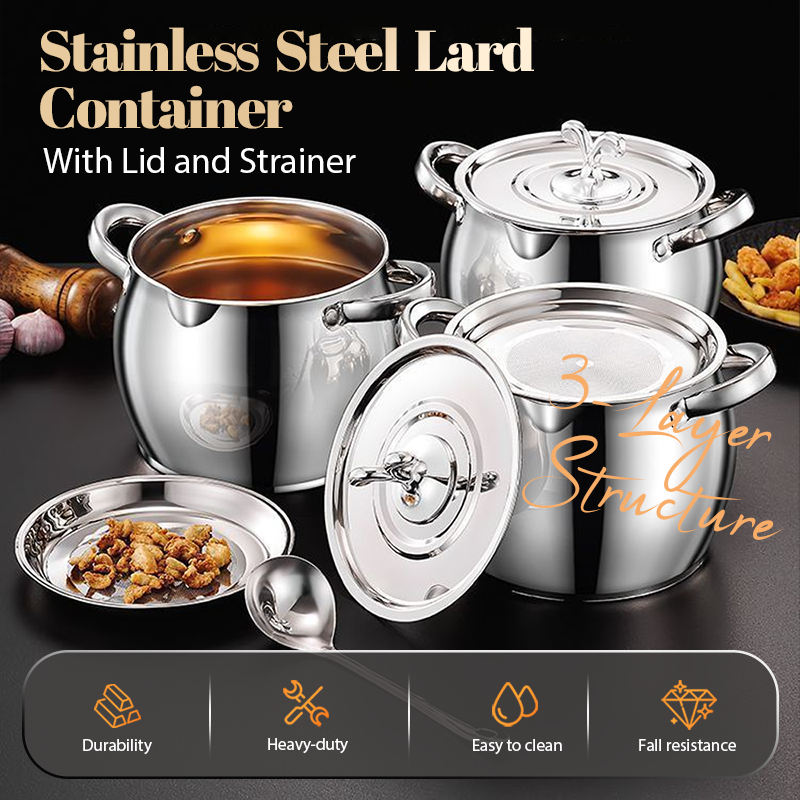EFFICIENT OIL-RESIDUE SEPARATION: Designed with a thick stainless steel body and a fine mesh strainer, this lard container ensures thorough oil filtration. It separates oil residue effectively during and after rendering, giving you clean, pure lard with minimal effort.