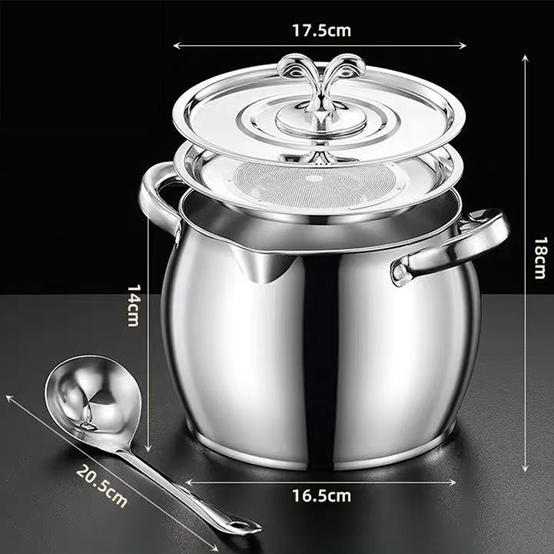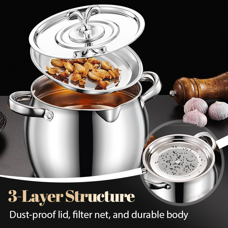 3-LAYER STRUCTURE DESIGN: The 3-part design includes a dust-proof lid, a built-in strainer, and a thick stainless steel pot body. This ensures hygiene, efficient filtering, and durability under high heat.