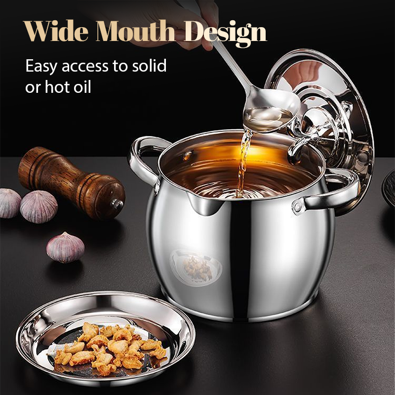 VERSATILE HANDLE & SPOUT DESIGN: Stable handles and drip-free pouring Ergonomic side handles offer a firm grip, even with hot oil. The smart spout design allows for precise, spill-free pouring. The lid also hooks onto the rim, keeping your countertop clean and your workspace organized.